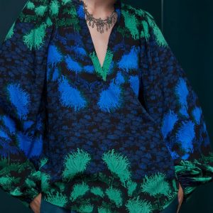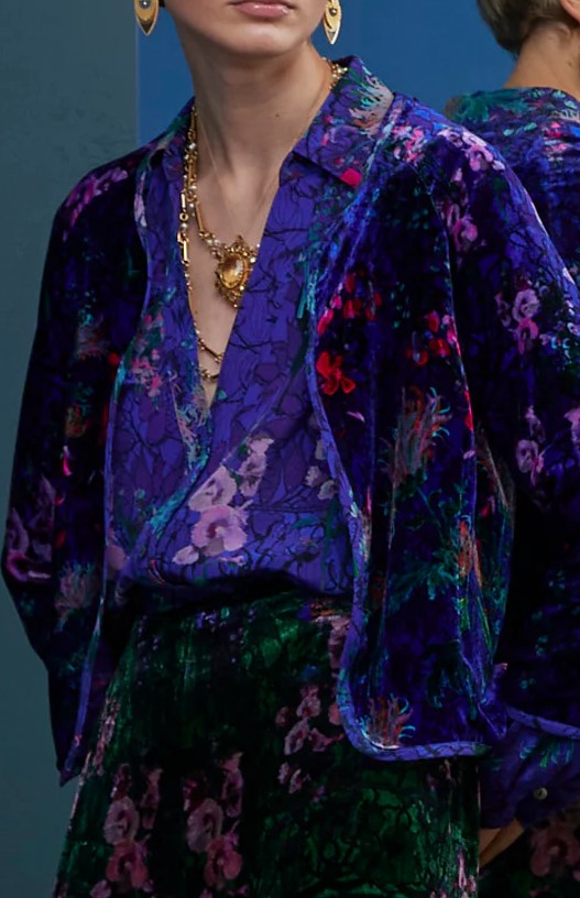 Blusa escote pico con estampado "floral sobre encaje", cierre con botones.