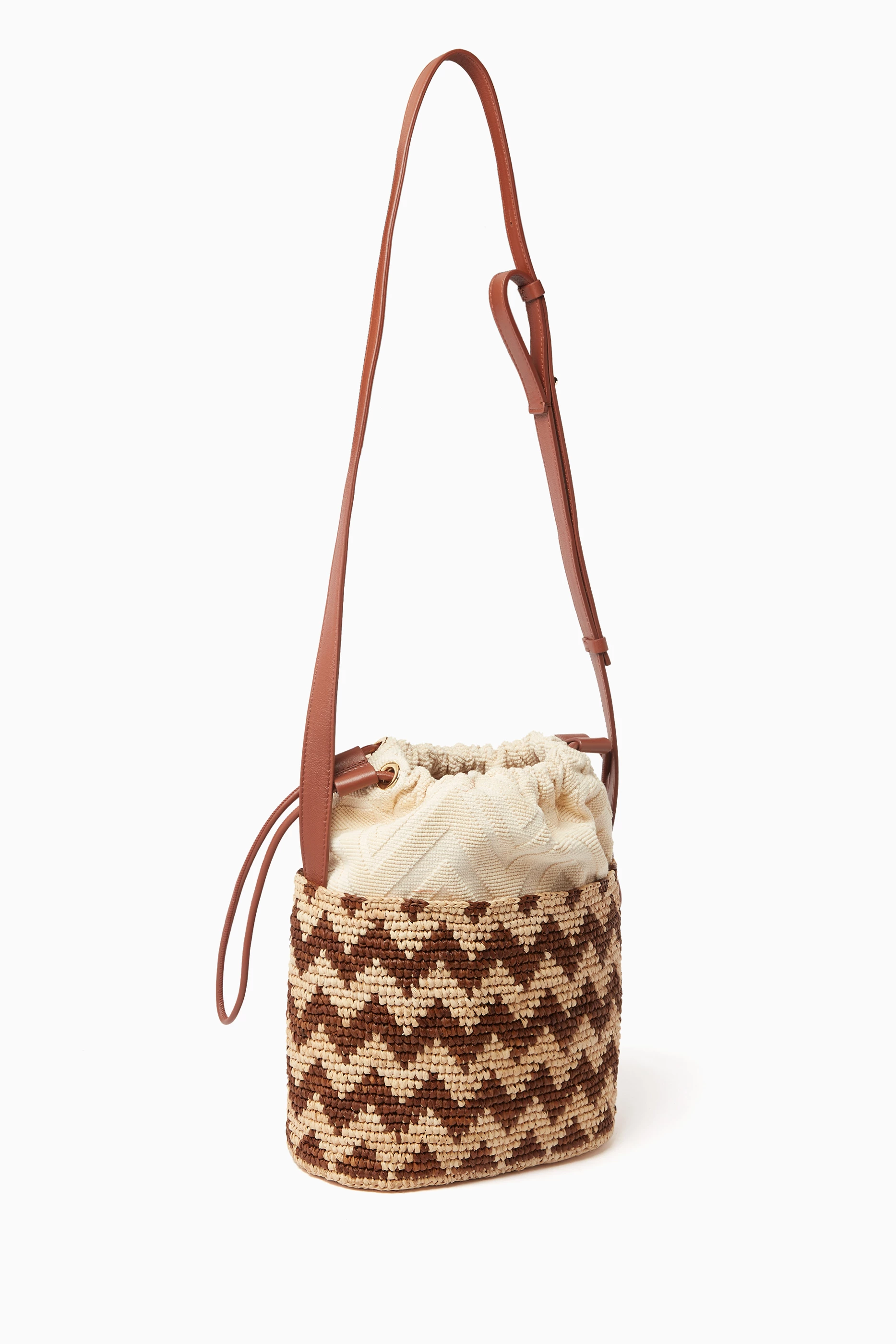 Bolso bucket de rafia tejida con asa superior de cuero regulable. Parche de cuero del nombre de la marca en el delantero. Compartimento único. Incluye bolsa con cierre fruncido, con botones a presión en sus laterales para poder fijarla a la cesta. Tejidos rayados en zigzag.