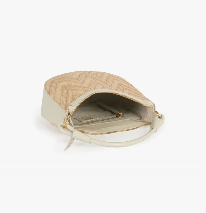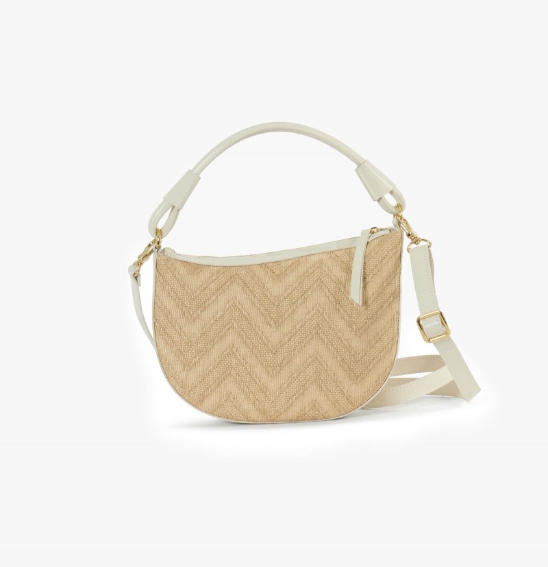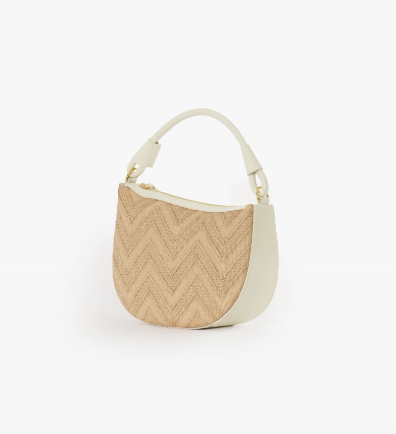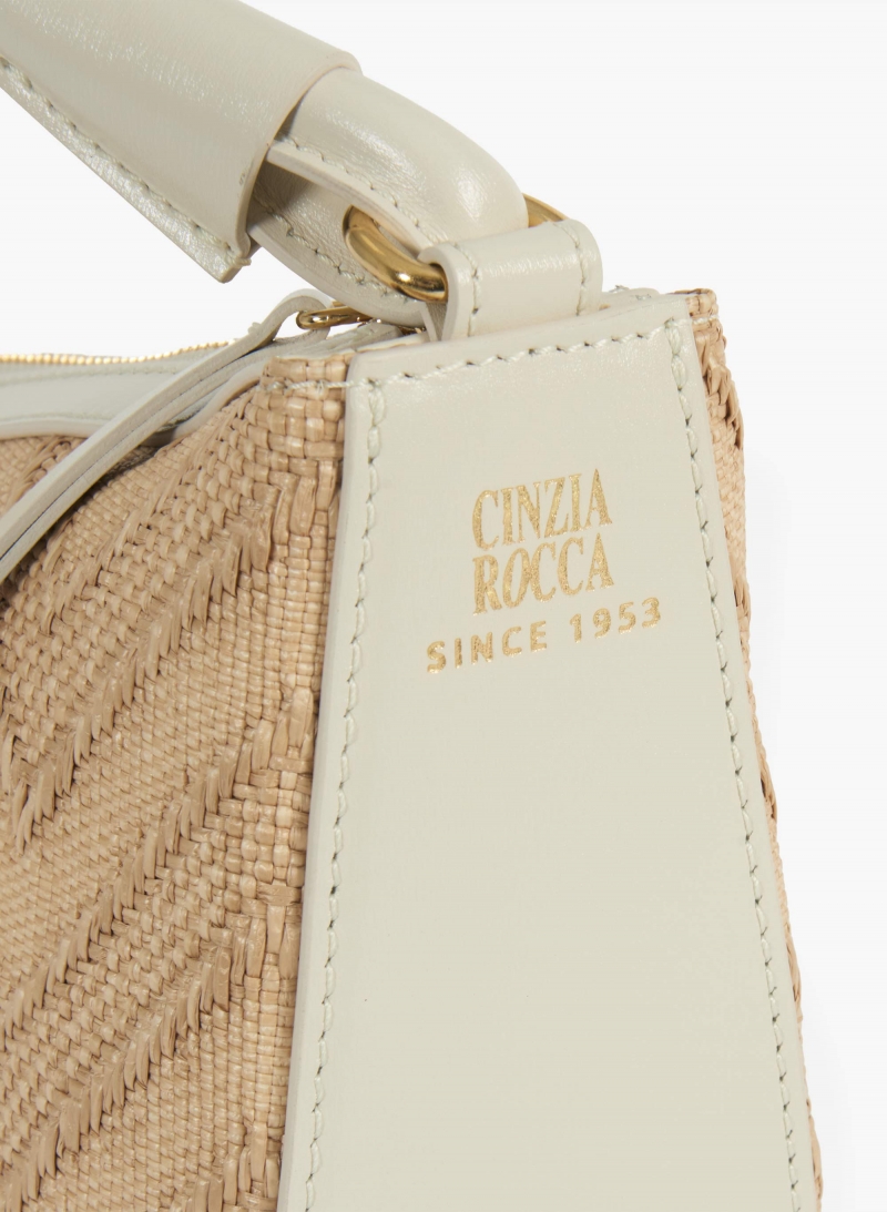 Bolso asimétrico de paja con detalles de piel, asas de piel, correa de hombro ajustable, cierre de cremallera, bolsillo interior abierto, bolsillo
