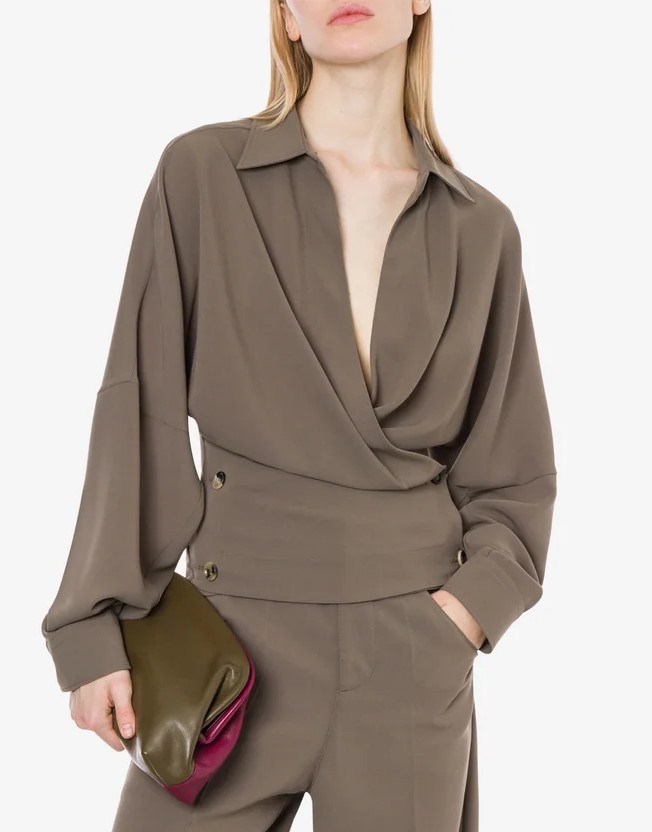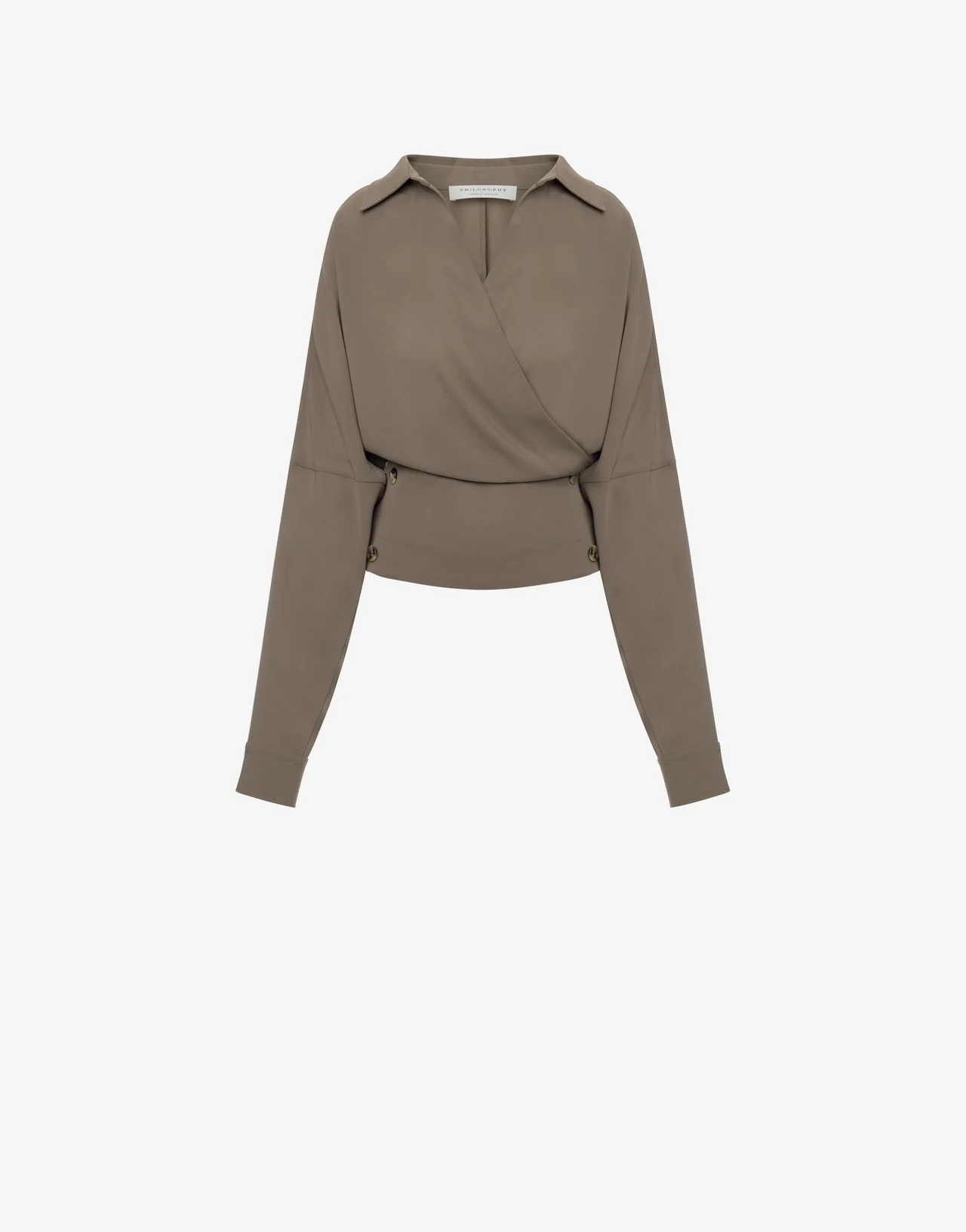 Camisa con cuello, escote cruzado y cierre lateral con botones.