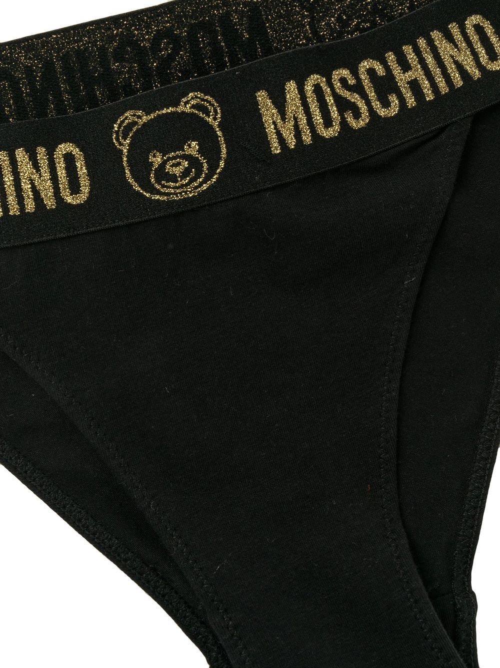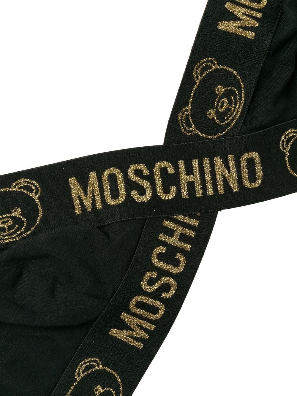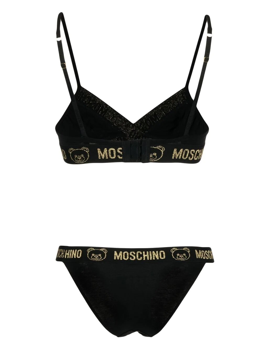 Conjunto de sujetador y braga con detalle cinta con logo brillante dorado y motivo Teddy Bear característico. El sujetador tiene copa de triángulo, correas de hombro ajustables, banda elástica, cierre con corchete en la parte posterior. Y la braga con cinturilla elástica y corte alto.