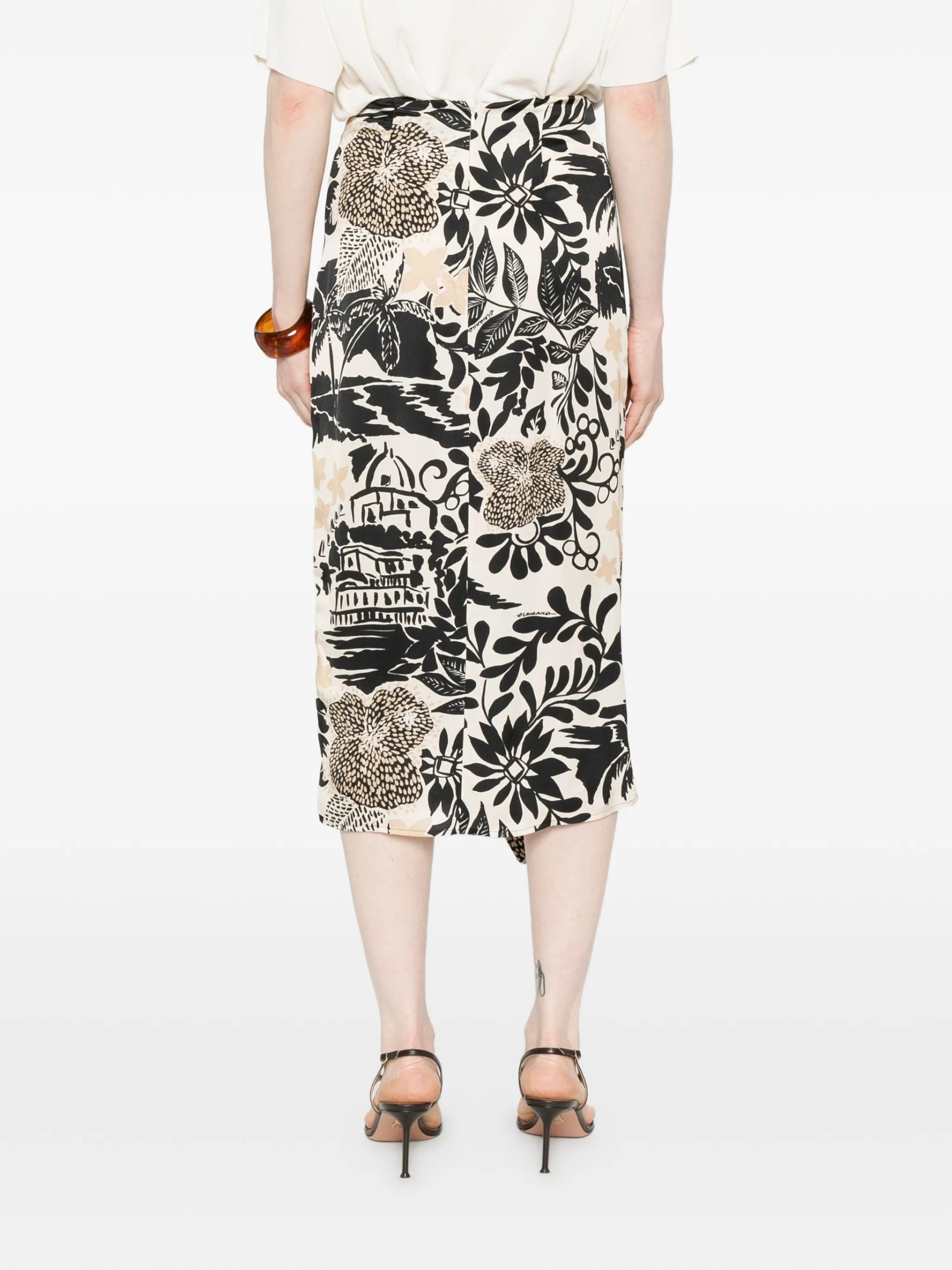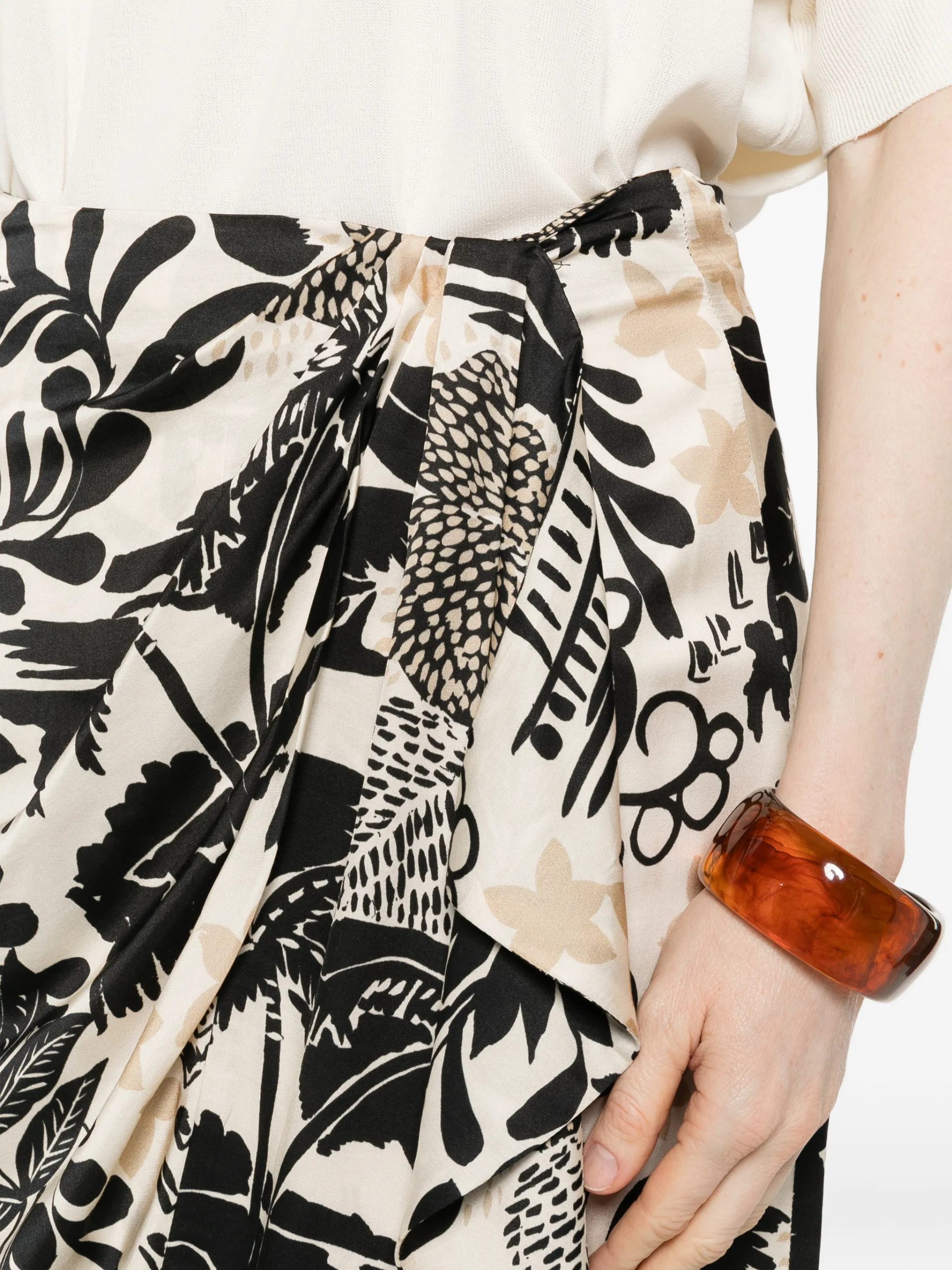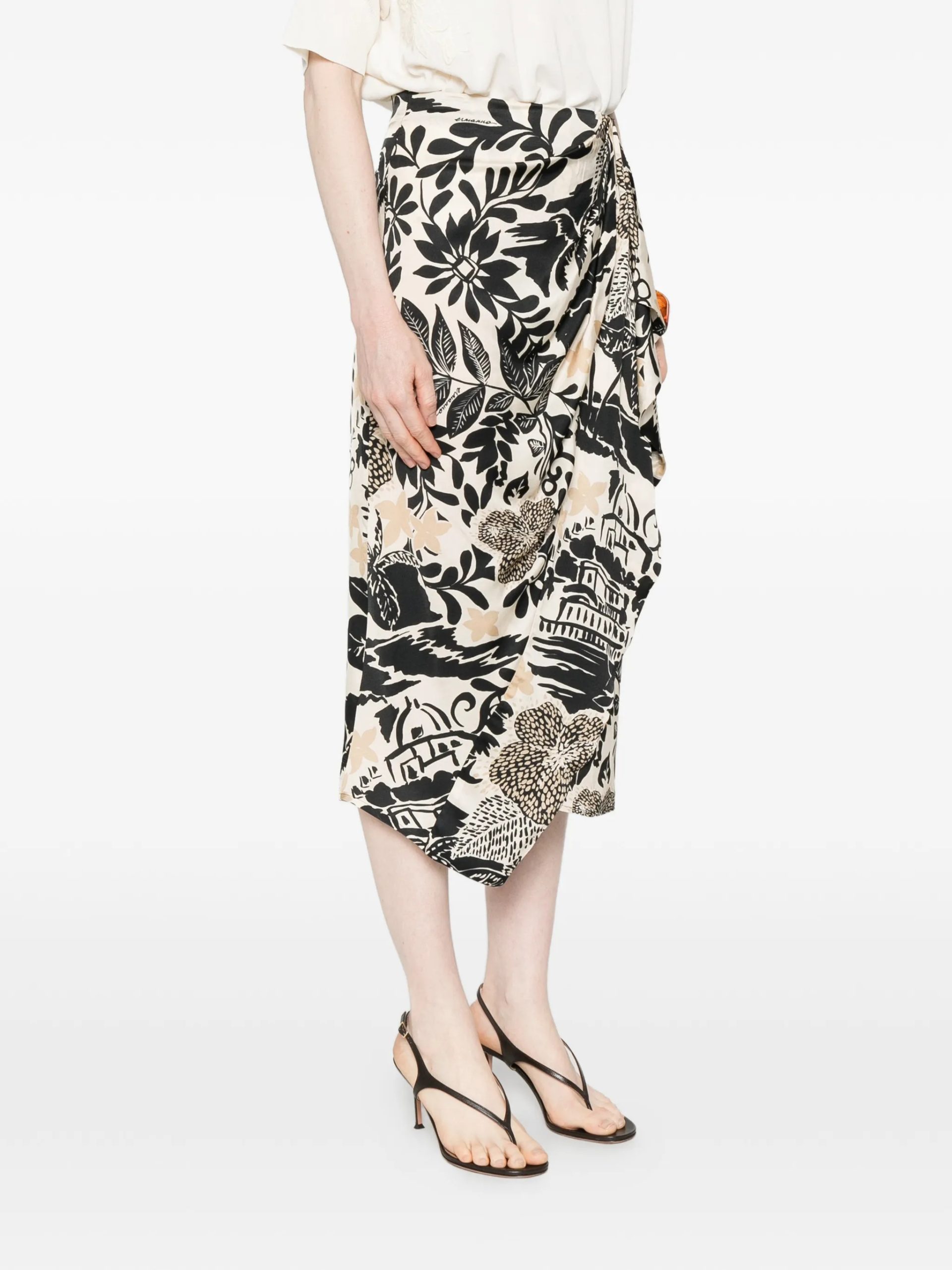 Falda con estampado floral, diseño drapeado, cierre con cremallera.
