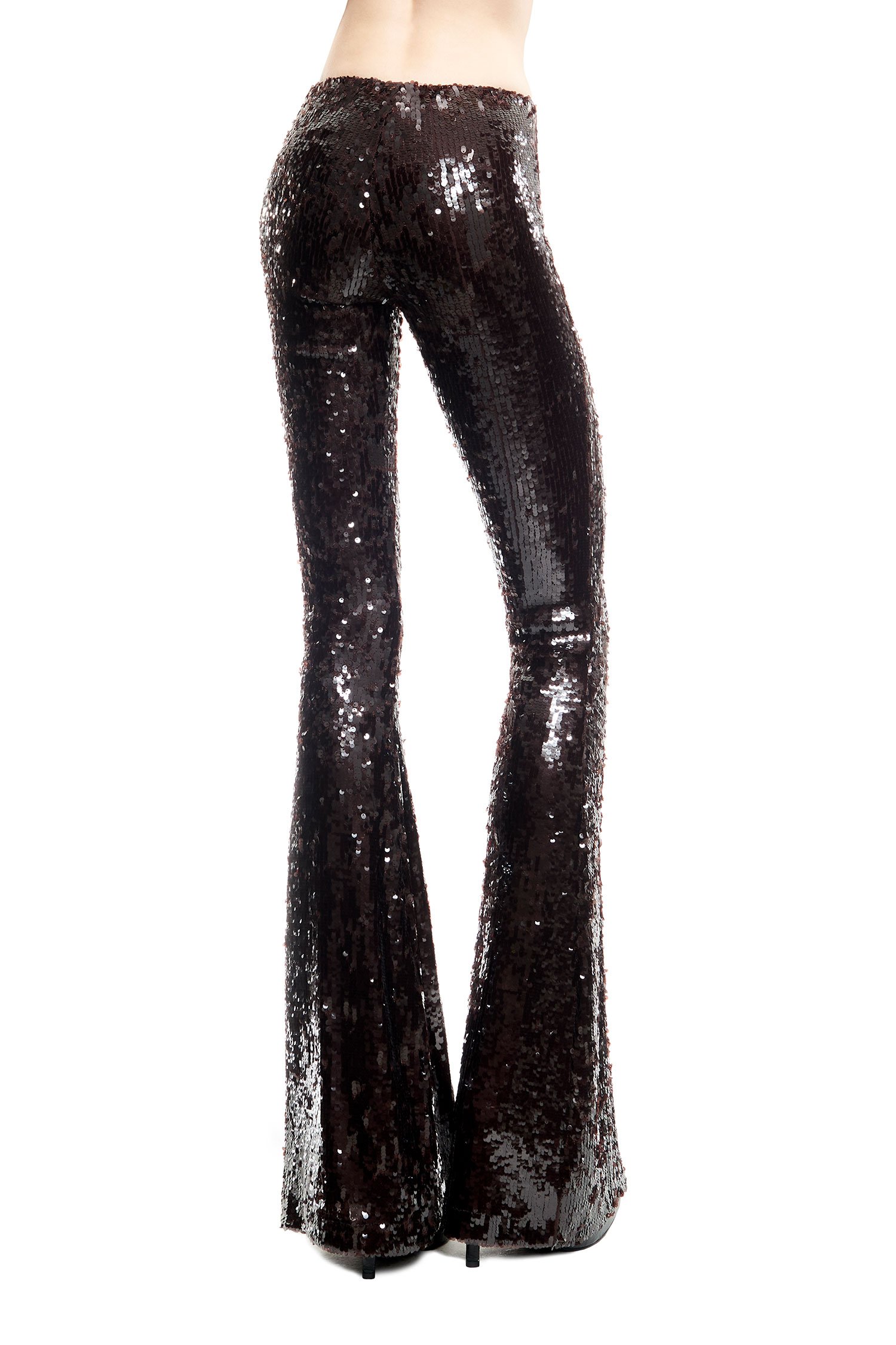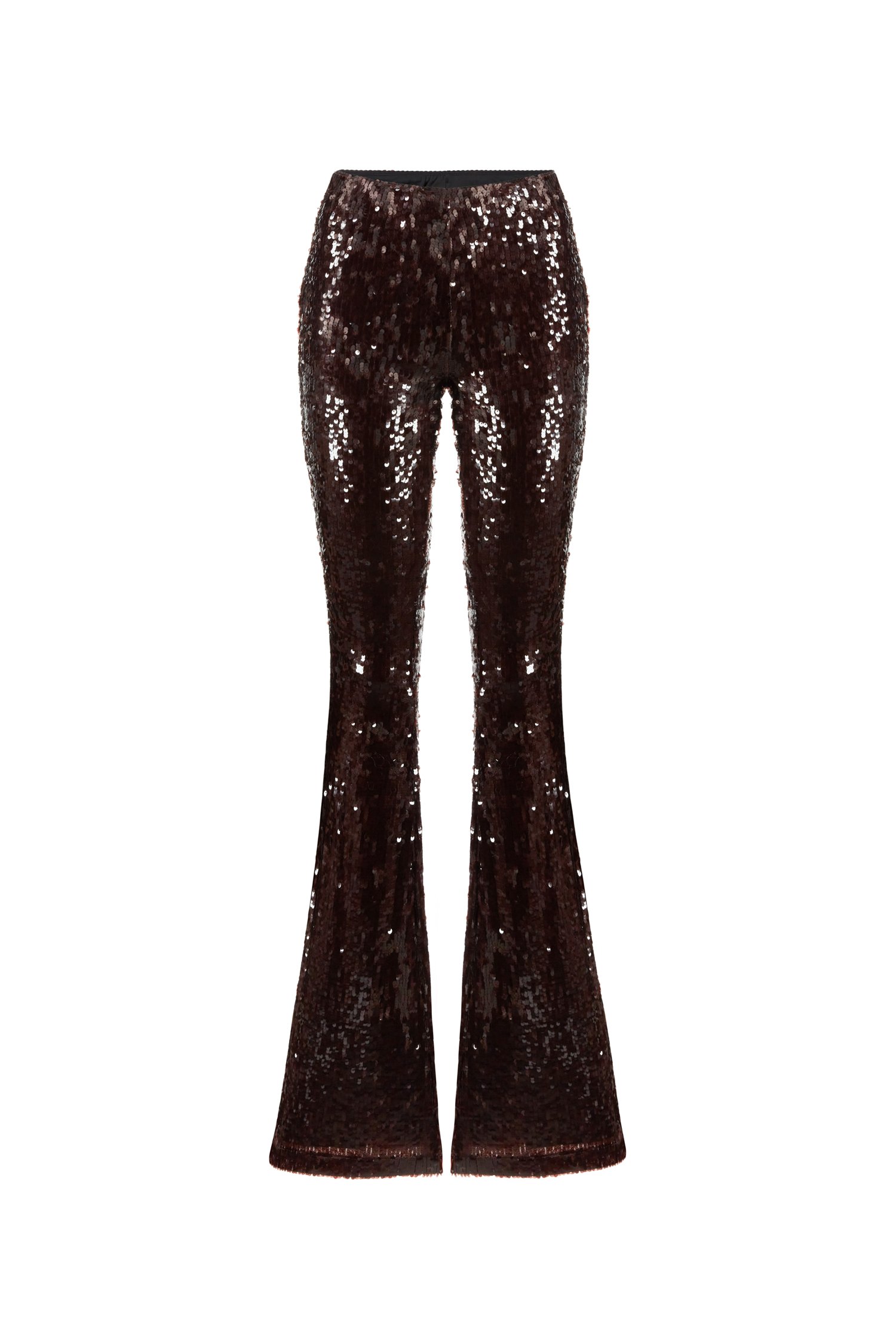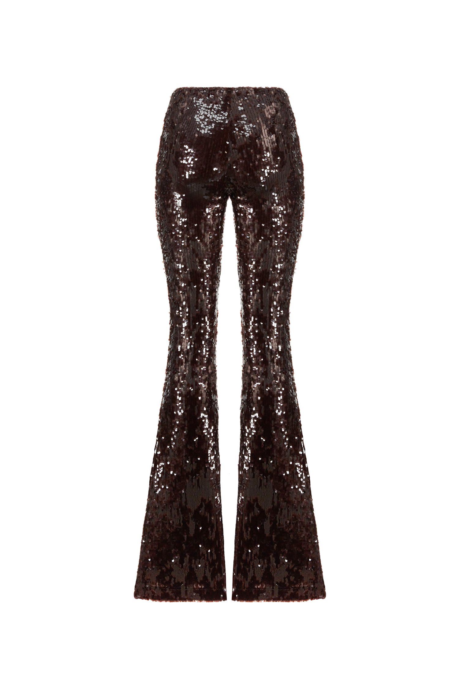 Pantalón acampanado de lentejuelas, cierre cremallera lateral.