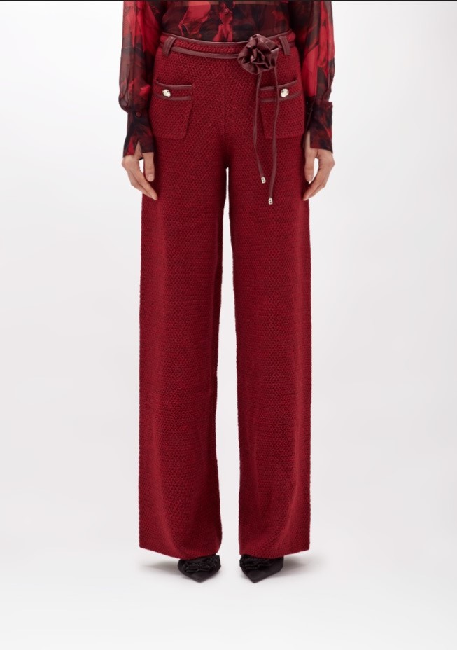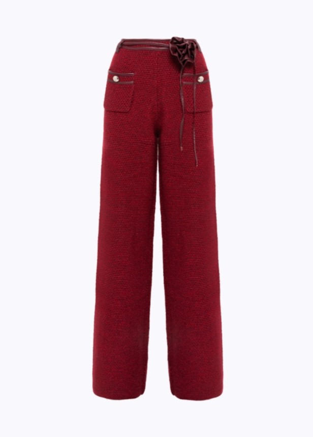 Pantalón de hilo bouclé acabado con trabillas en polipiel, cierre con cremallera invisible en la parte trasera, bolsillos con botones joya, cinturon desmontable a juego.