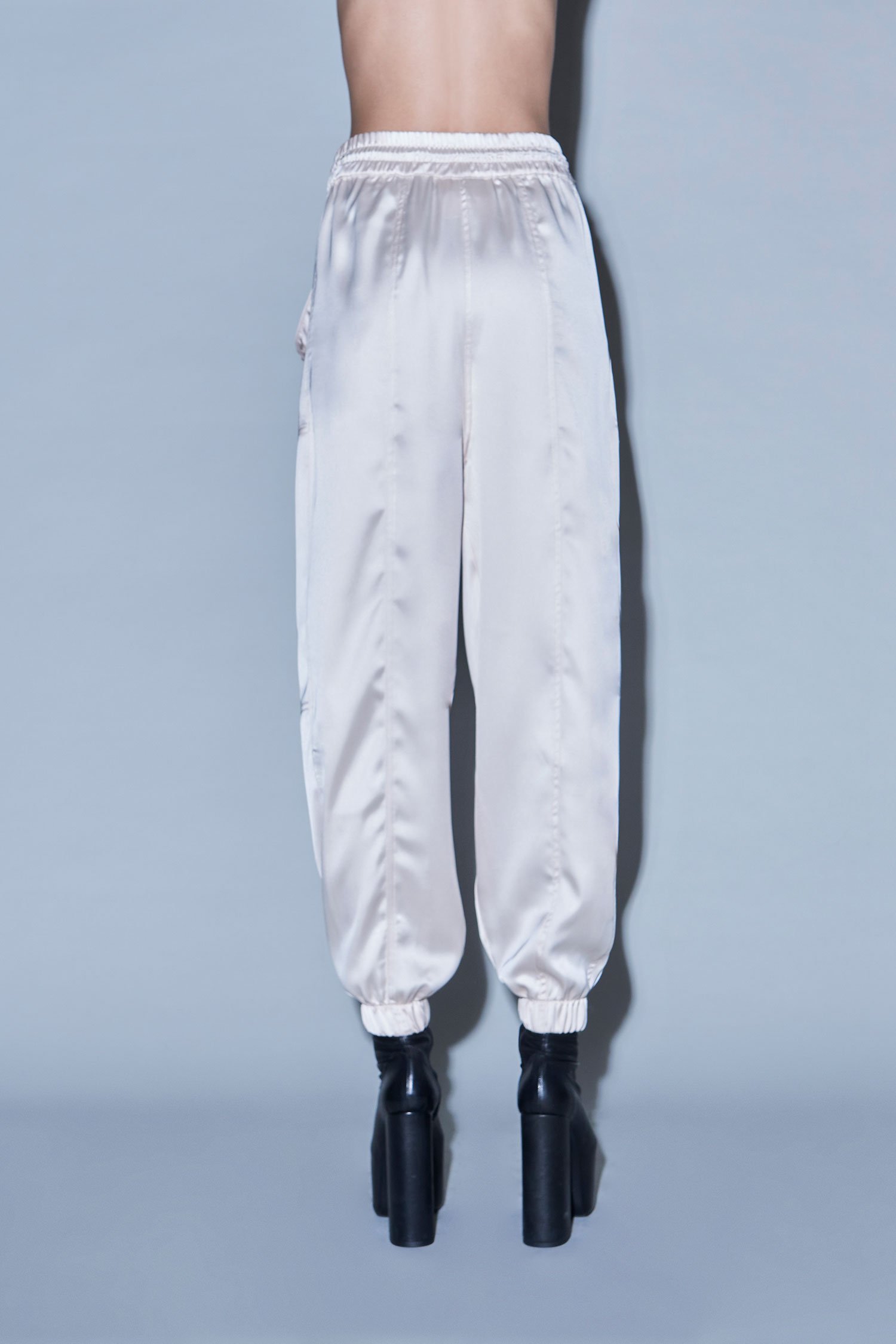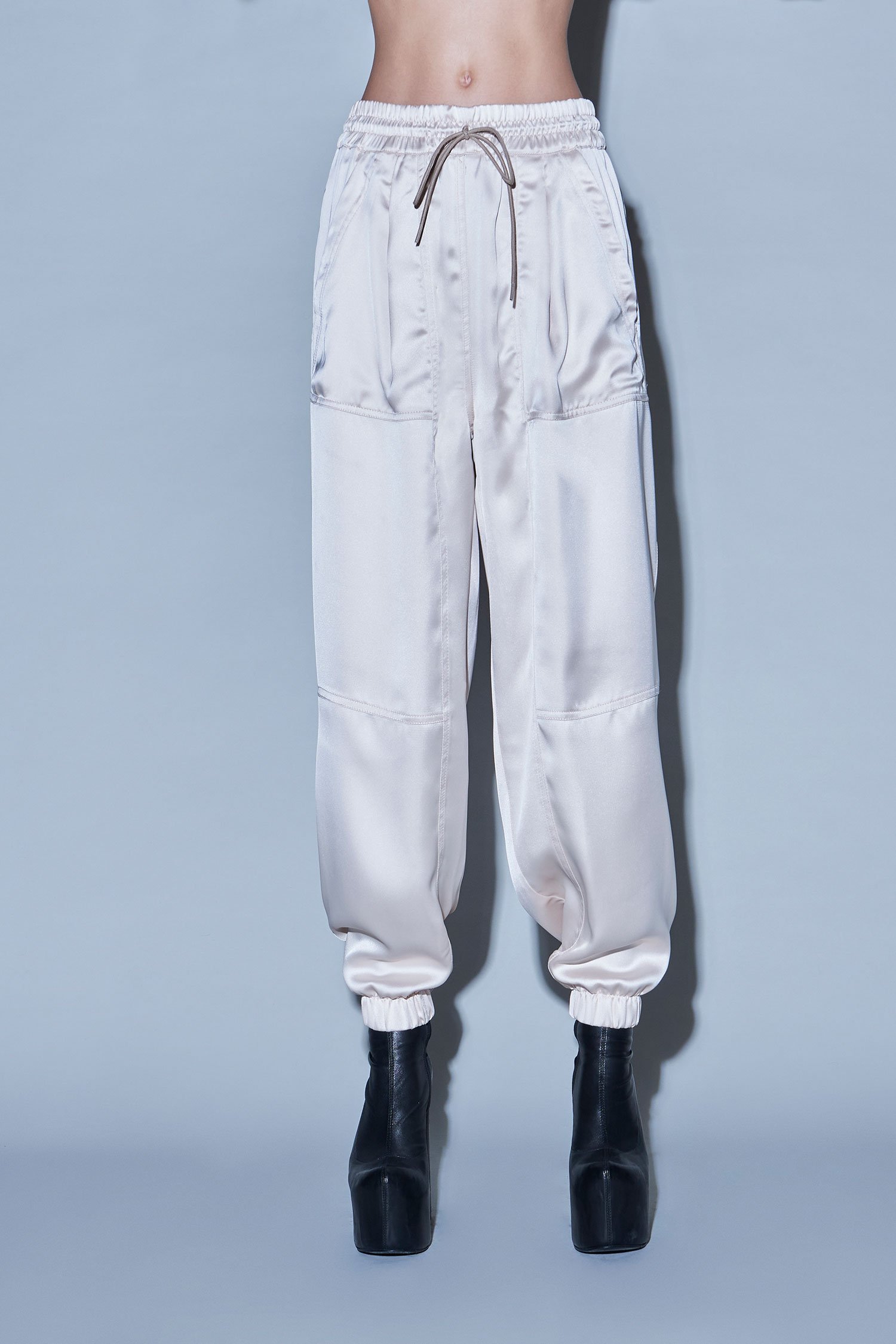 Pantalón de satén suave con cordón en la cintura y puños en el bajo.