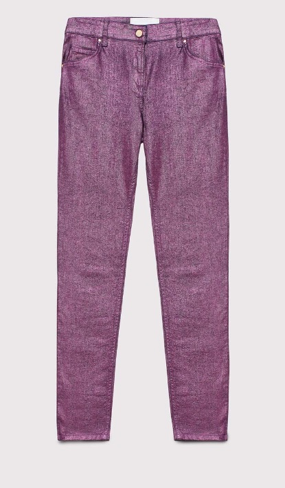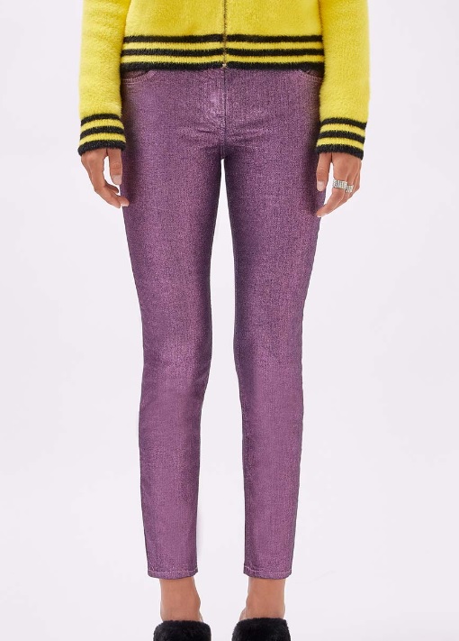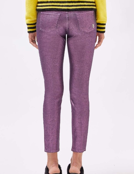 Pantalón pitillo cinco bolsillos, acabado en denim brillante con trabillas. Cremallera y botón de tachuela con la marca. Personalizado por el logo de la marca en el bolsillo trasero.
