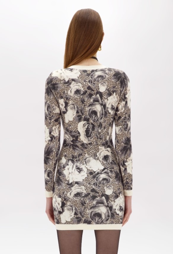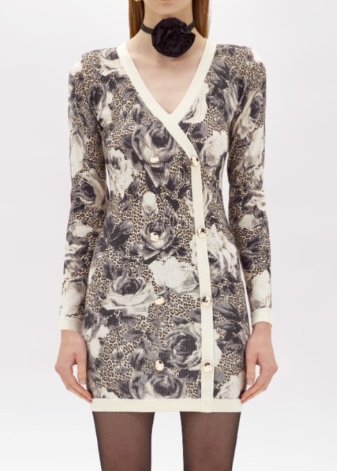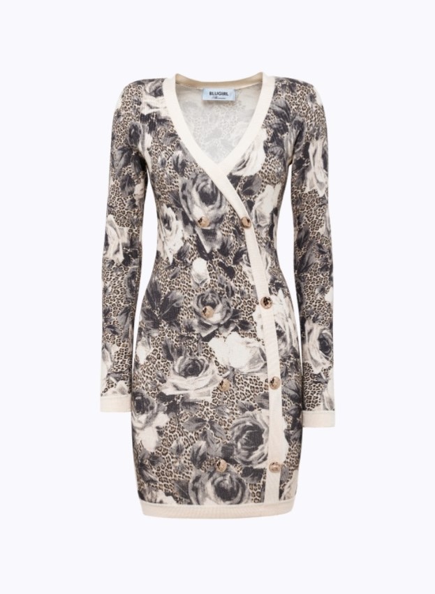 Vestido diseño cruzado con estampado de rosas, escote en V, mangas largas, botones joya en la parte delantera.