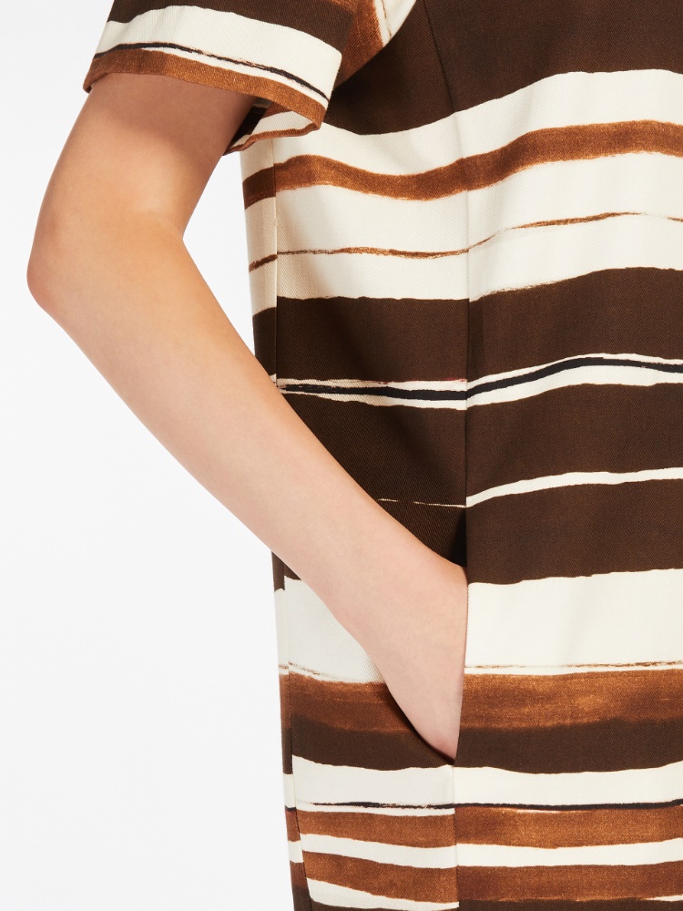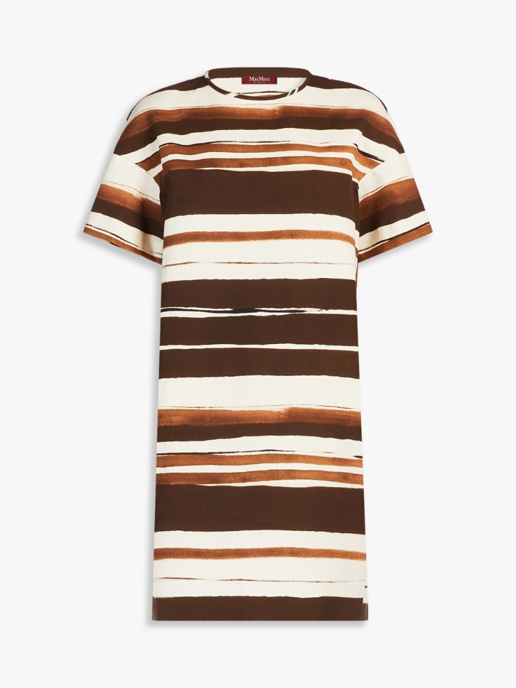 Vestido corto tipo camiseta confeccionado en dril de lino y algodón estampado. Modelo con silueta acampanada, cuello redondo, manga corta con hombros caídos y bolsillos insertados en los laterales. Sin forro, con cierre con motivo de lágrima en la espalda.
