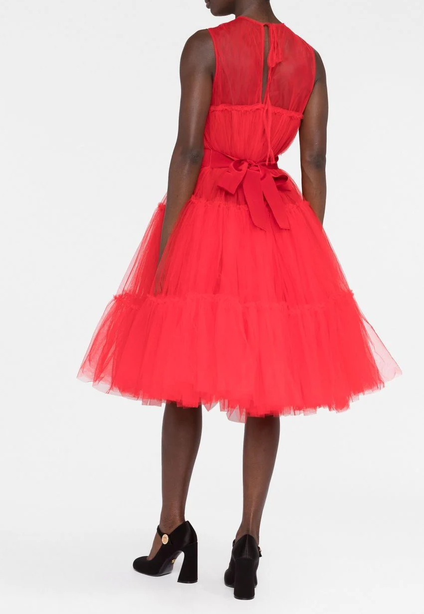 Vestido midi de tul, escote redondo, sin mangas, corpiño de escote de corazón, abertura en forma de lágrima en la espalda con lazada en el cuello, fajín extraíble en la cintura y falda con doble forro de tul para aportar volumen.