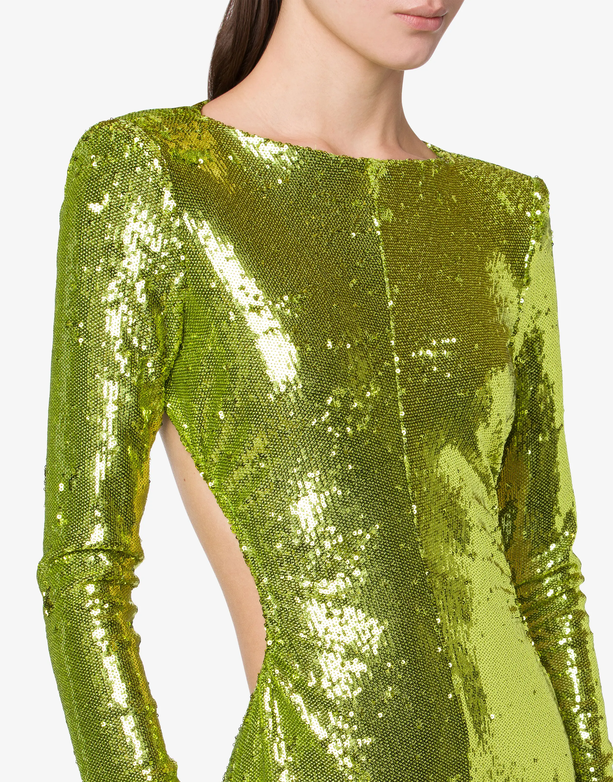 Vestido largo de lentejuelas con forro de tul elástico. Corte entallado, hombreras acolchadas, mangas extralargas, cierre trasero en el cuello con cinta de terciopelo y cierre trasero con cremallera oculta.