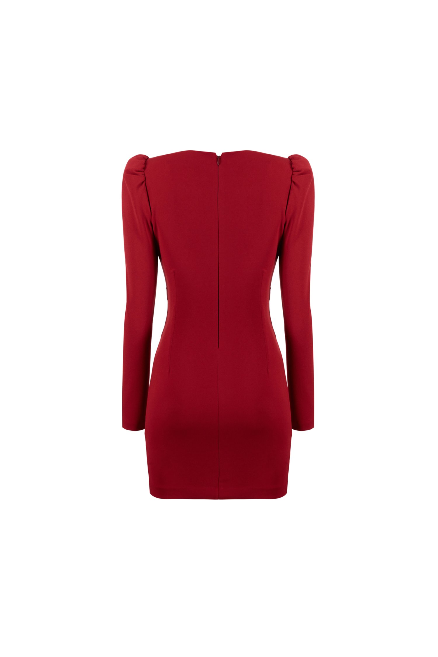 Vestido tubo con falda asimétrica y mangas fruncidas en los hombros.