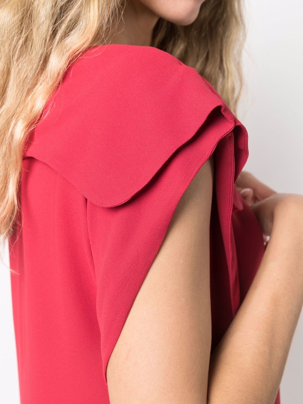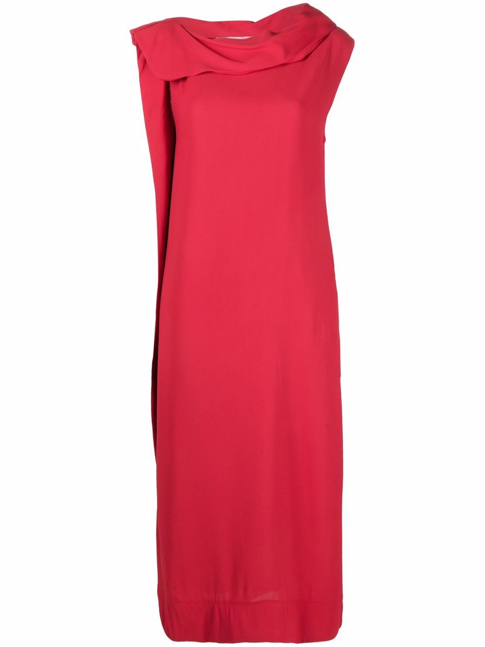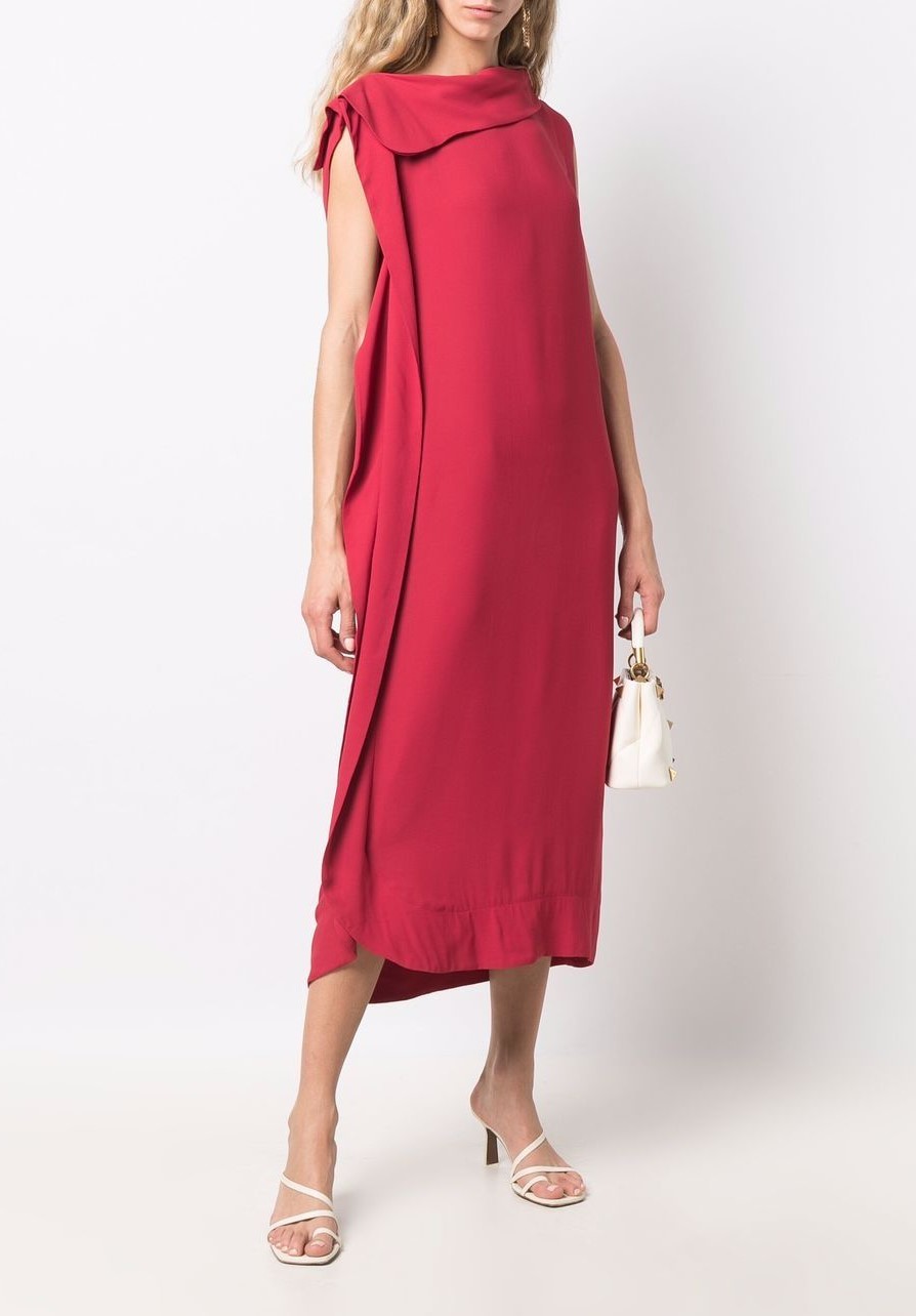 Vestido diseño asimétrico, cuello oblicuo, detalle drapeado, manga corta, diseño a media pierna y dobladillo recto.